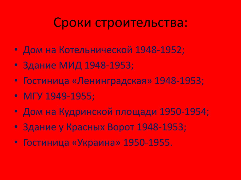 Сроки строительства:Дом на Котельнической 1948-1952;