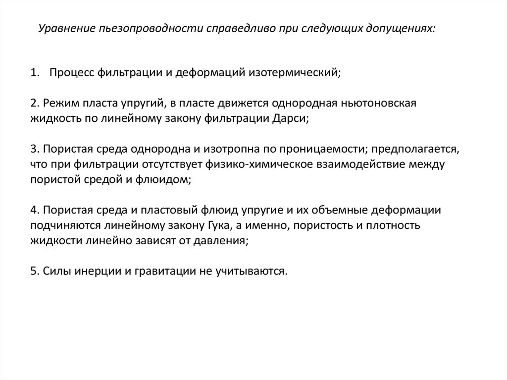Уравнение пьезопроводности справедливо при следующих допущениях:1. Процесс фильтрации и деформаций изотермический;