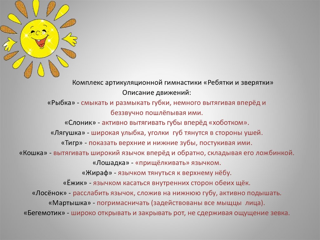 Комплекс артикуляционной гимнастики «Ребятки и зверятки»Описание движений: