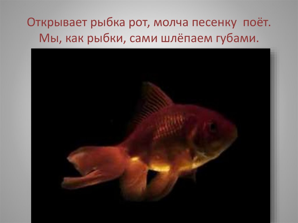 Открывает рыбка рот, молча песенку поёт.Мы, как рыбки, сами шлёпаем губами.