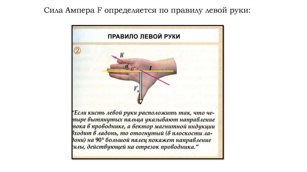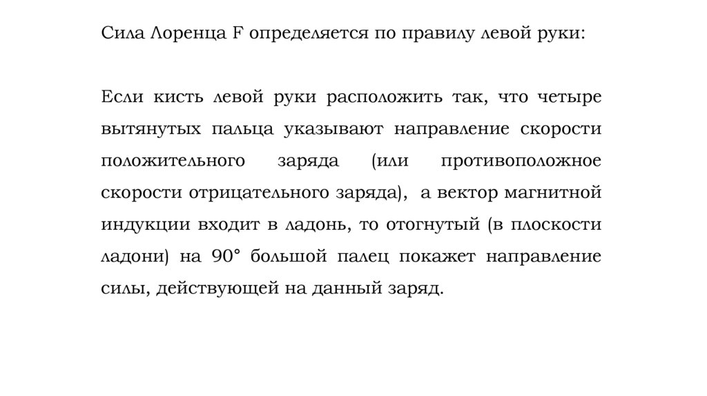 Сила Лоренца F определяется по правилу левой руки:Если кисть левой руки расположить так, что четыре