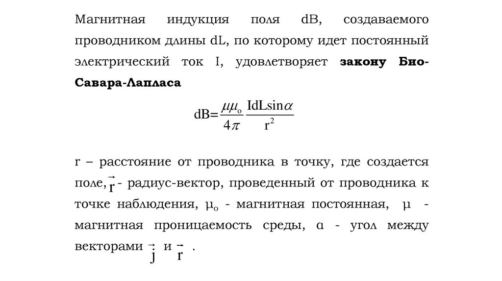 электрический ток I, удовлетворяет закону БиоСавара-Лапласа