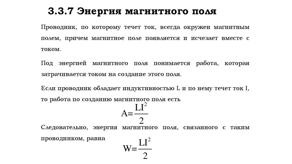 3.3.7 Энергия магнитного поляПроводник, по которому течет ток, всегда окружен магнитным