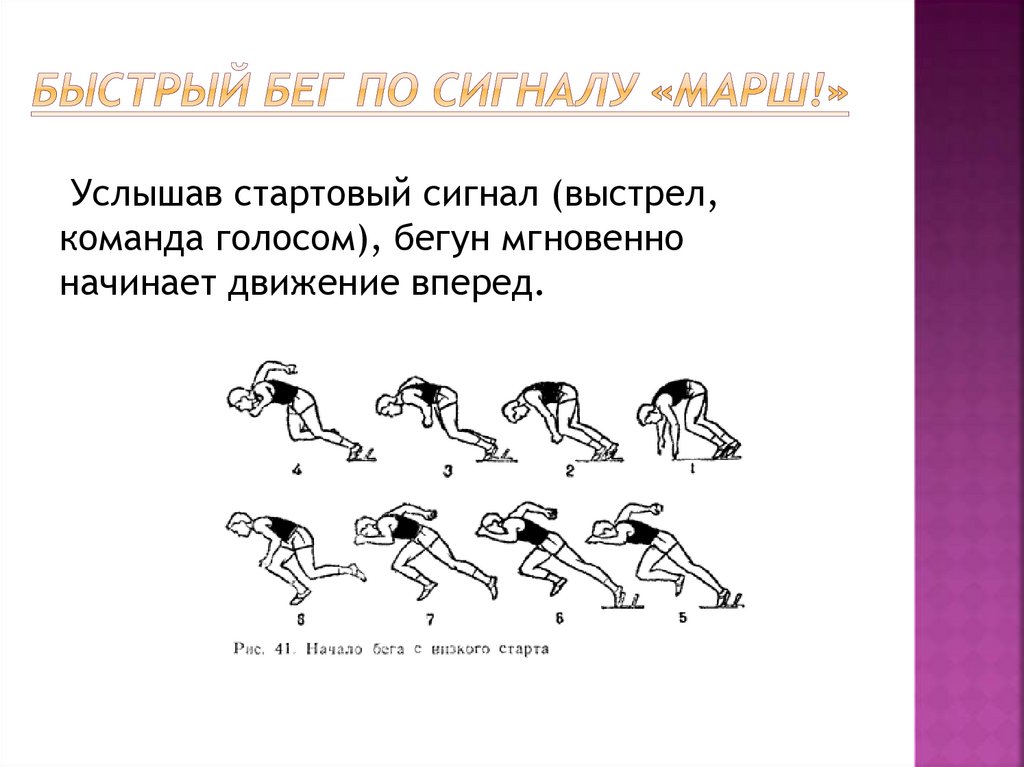 Услышав стартовый сигнал (выстрел,команда голосом), бегун мгновенно