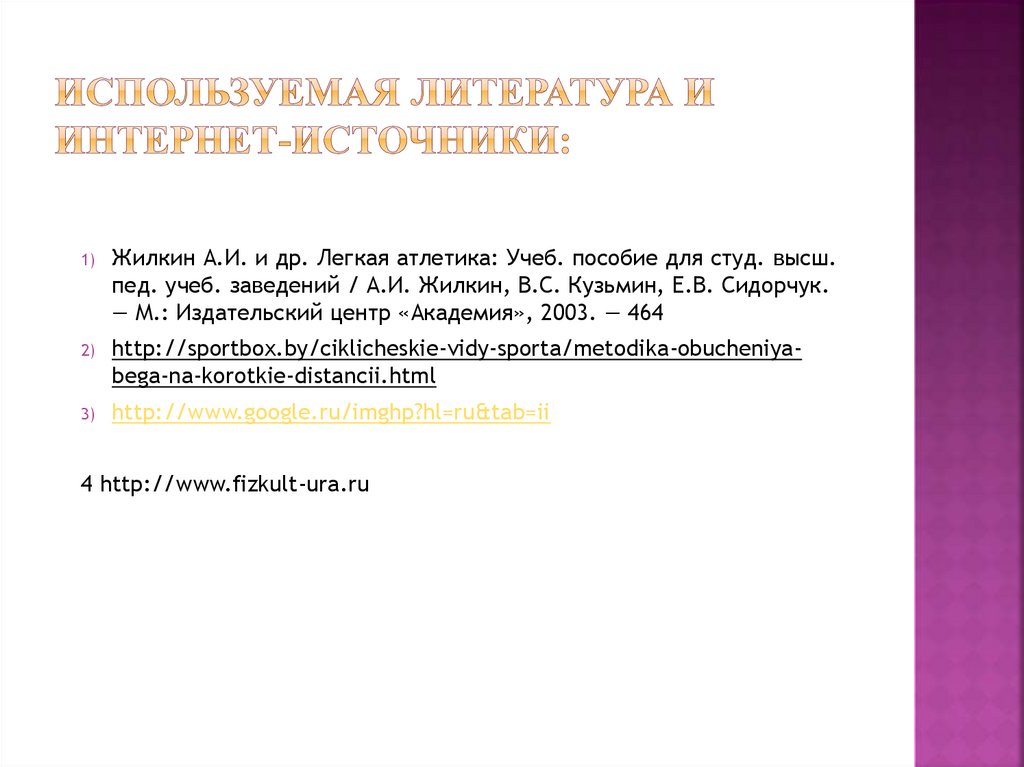 1)Жилкин А.И. и др. Легкая атлетика: Учеб. пособие для студ. высш.