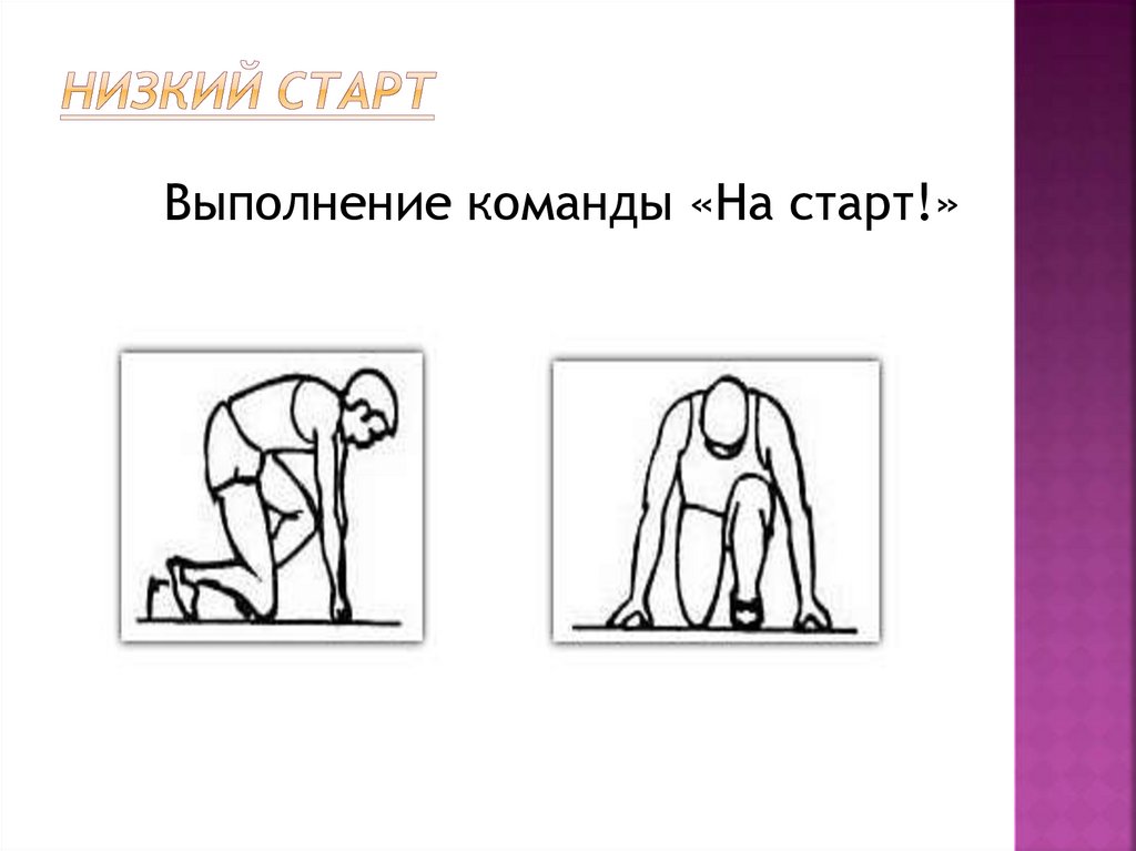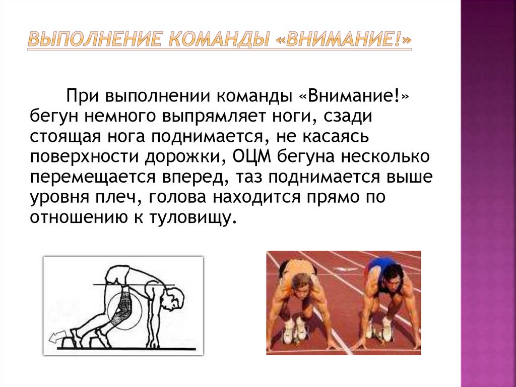 При выполнении команды «Внимание!»бегун немного выпрямляет ноги, сзади