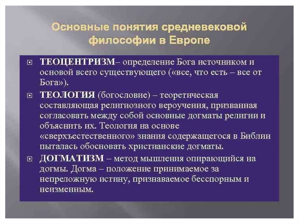 Основные понятия средневековой философии: теология теоцентризм догма (догматизм)