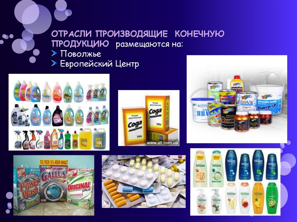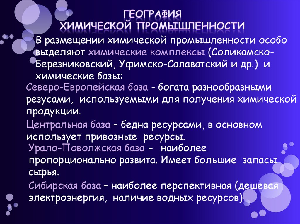В размещении химической промышленности особовыделяют химические комплексы (СоликамскоБерезниковский, Уфимско-Салаватский и др.) и
