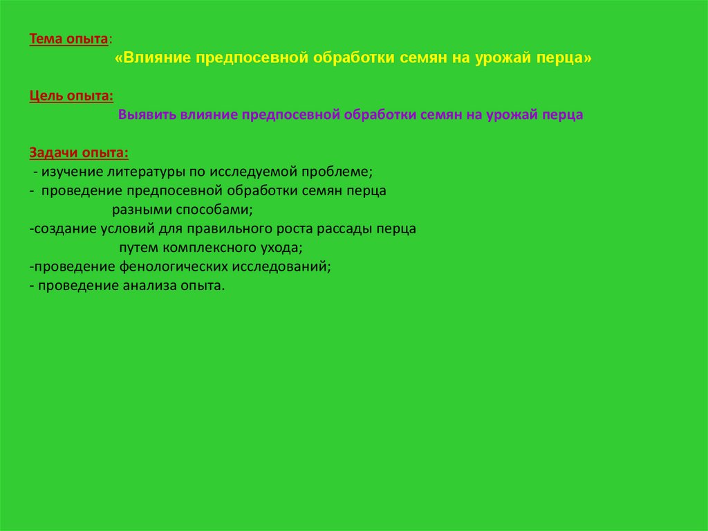Тема опыта:«Влияние предпосевной обработки семян на урожай перца»