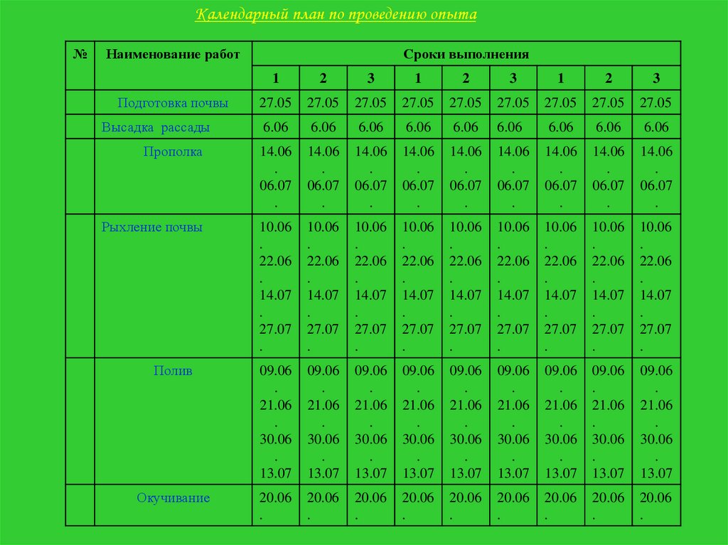 Календарный план по проведению опыта№