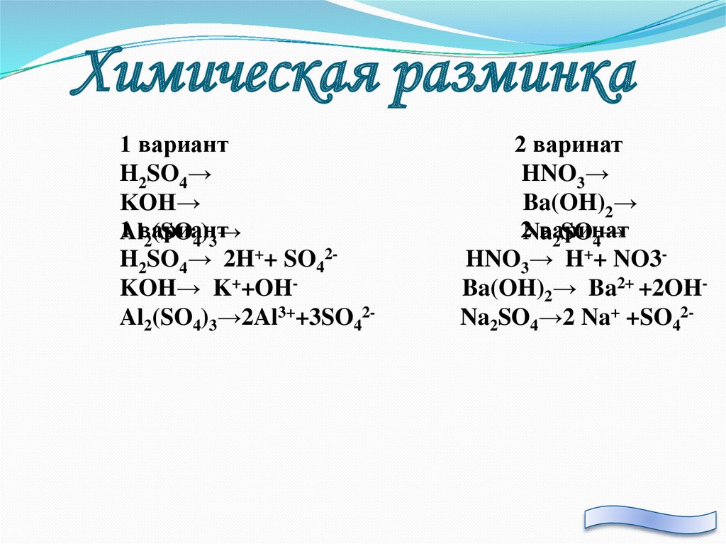 HNO3→ H++ NO3Ba(OH)2→ Ba2+ +2OHNa2SO4→2 Na+ +SO42-