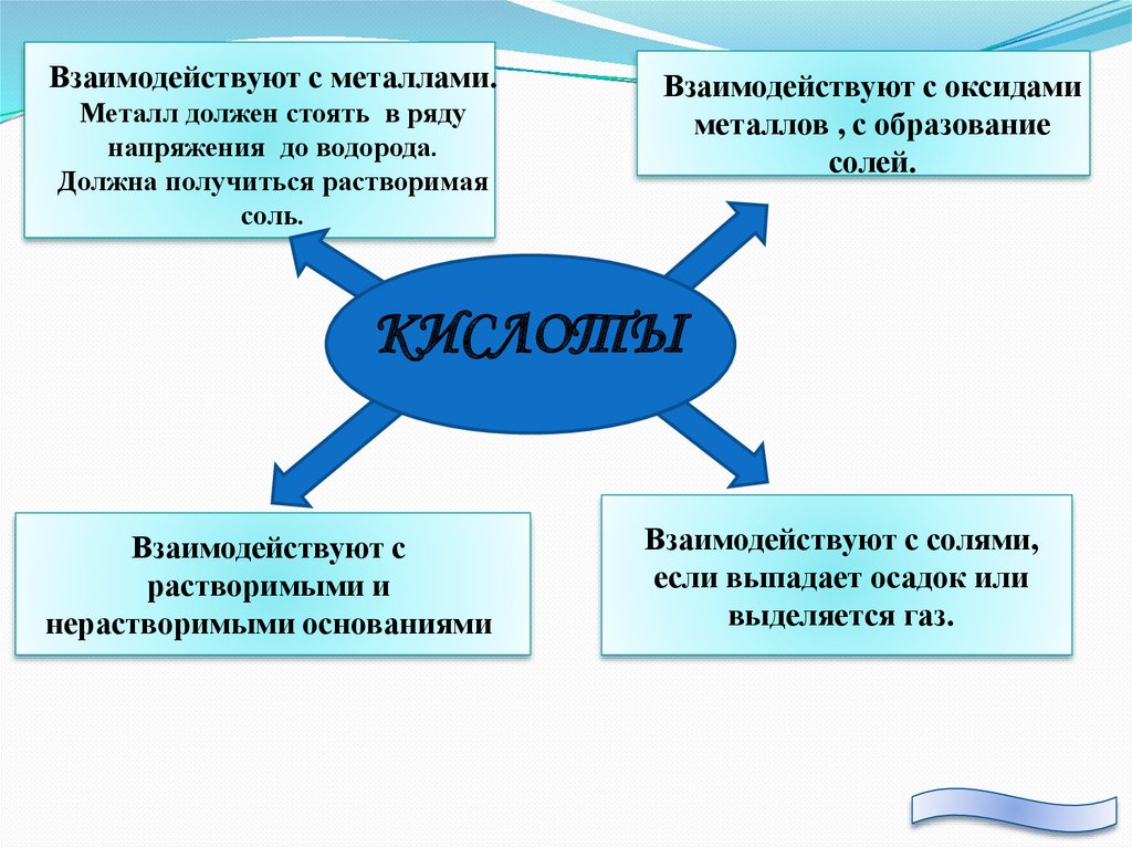 Взаимодействуют с металлами.Металл должен стоять в ряду