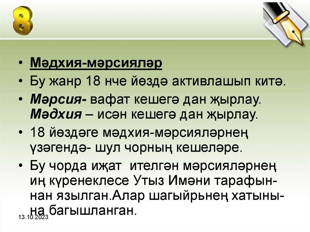 • Мәдхия-мәрсияләр• Бу жанр 18 нче йөздә активлашып китә.
