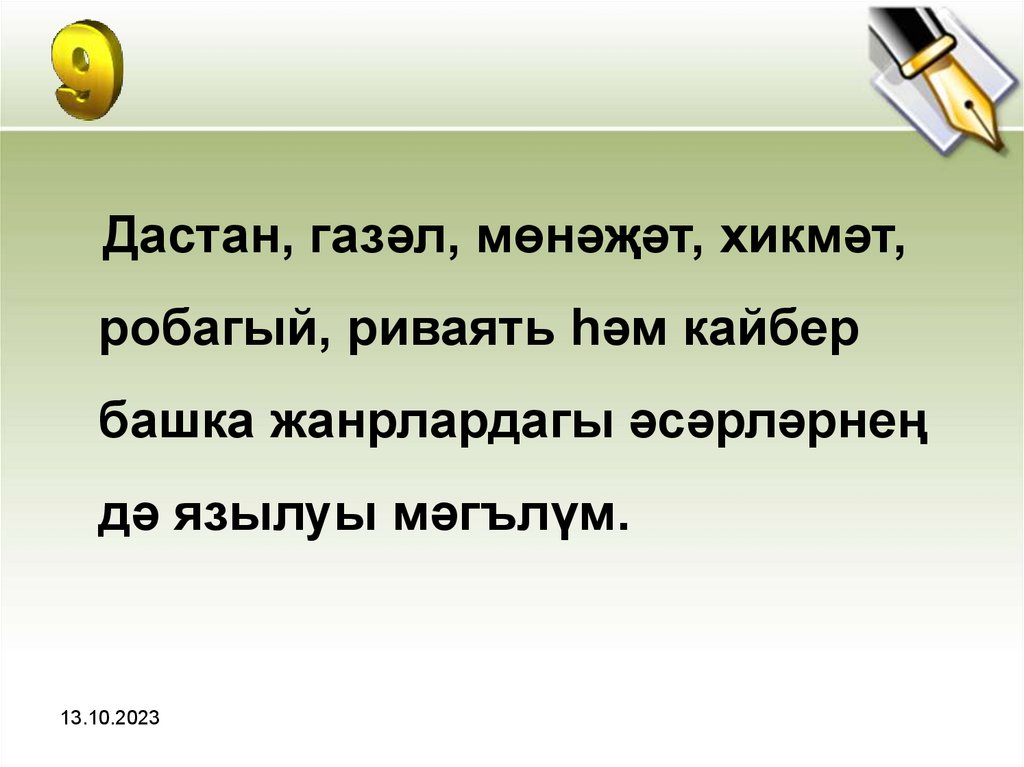 Дастан, газәл, мөнәҗәт, хикмәт,робагый, риваять һәм кайбер