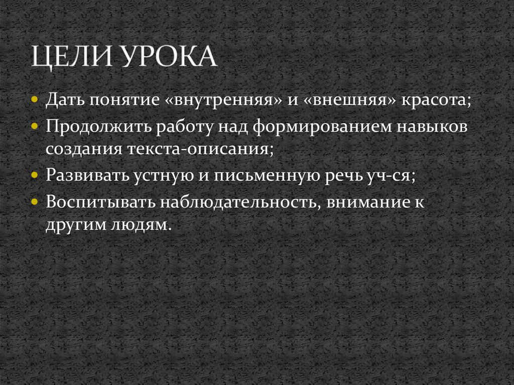 Дать понятие «внутренняя» и «внешняя» красота;Продолжить работу над формированием навыков