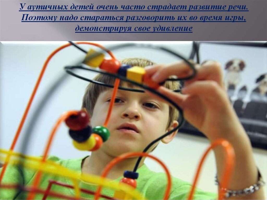 У аутичных детей очень часто страдает развитие речи.Поэтому надо стараться разговорить их во время игры,