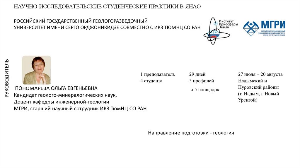 НАУЧНО-ИССЛЕДОВАТЕЛЬСКИЕ СТУДЕНЧЕСКИЕ ПРАКТИКИ В ЯНАОРУКОВОДИТЕЛЬ
