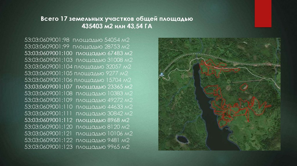Всего 17 земельных участков общей площадью435403 м2 или 43,54 ГА