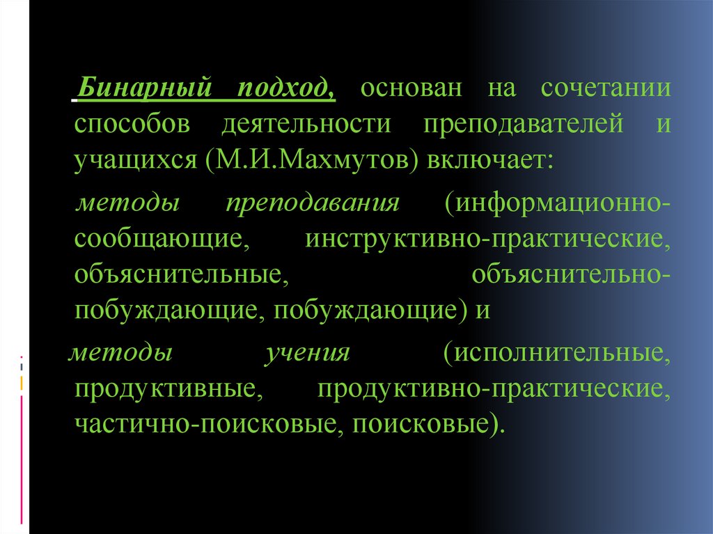 Бинарный подход, основан на сочетанииспособов деятельности преподавателей и