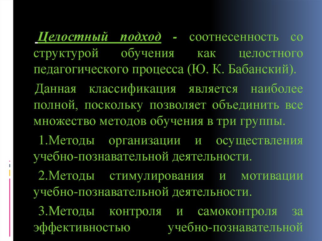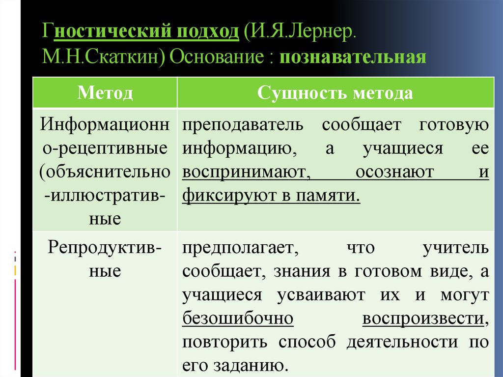 Гностический подход (И.Я.Лернер.М.Н.Скаткин) Основание : познавательная