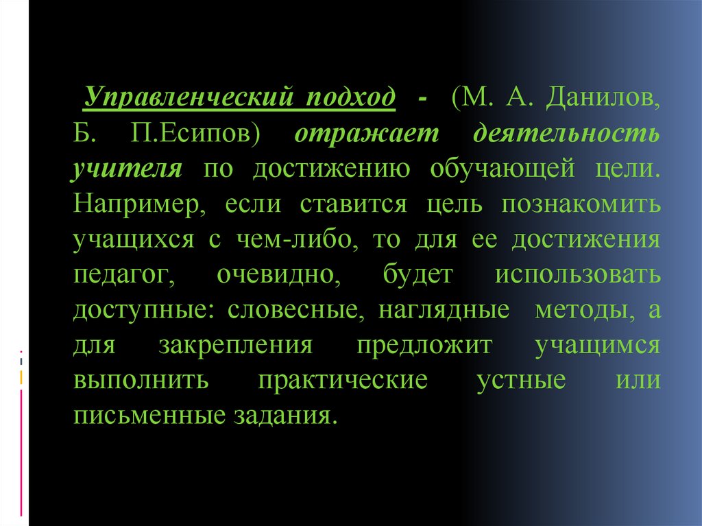 Управленческий подход - (М. А. Данилов,Б. П.Есипов) отражает деятельность
