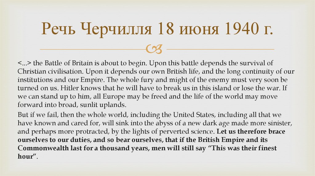 Речь Черчилля 18 июня 1940 г.<...> the Battle of Britain is about to begin. Upon this battle depends the survival of