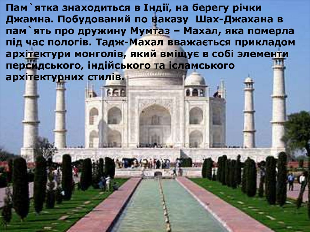 пам`ять про дружину Мумтаз – Махал, яка померла