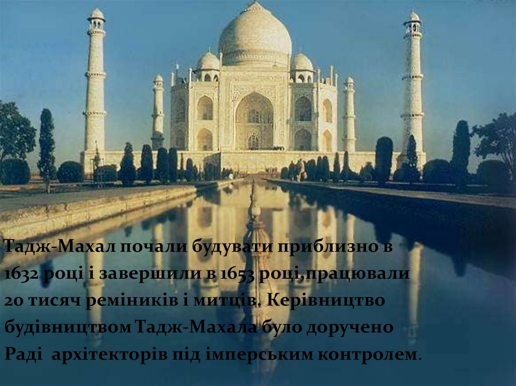 Тадж-Махал почали будувати приблизно в1632 році і завершили в 1653 році,працювали