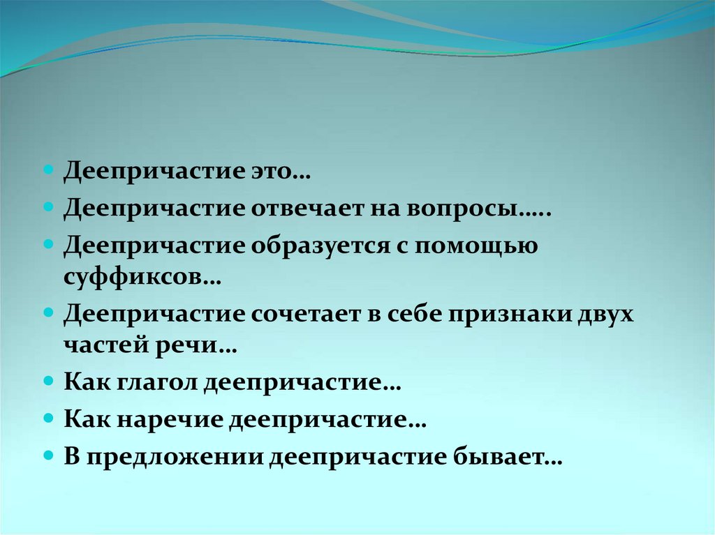 Деепричастие это…Деепричастие отвечает на вопросы…..
