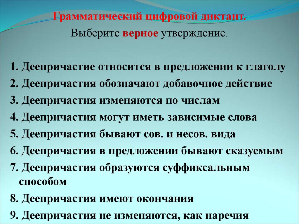 Ключ к заданию: 1,2,4,5,7,912. Задание: определите морфологические признаки деепричастий: