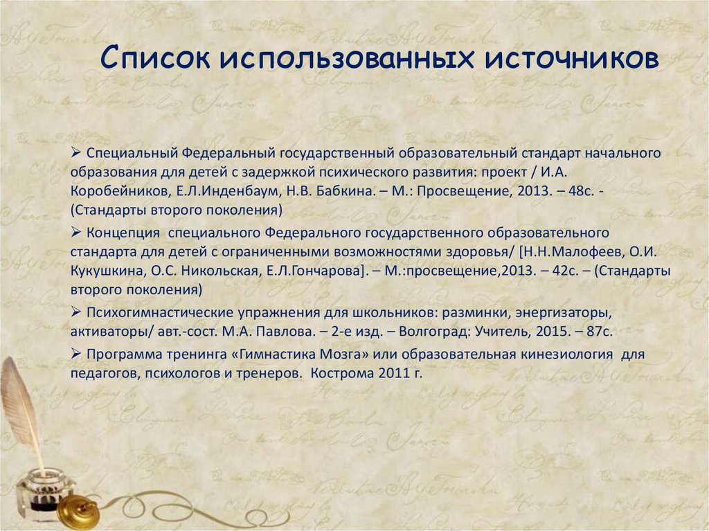 Список использованных источниковСпециальный Федеральный государственный образовательный стандарт начального