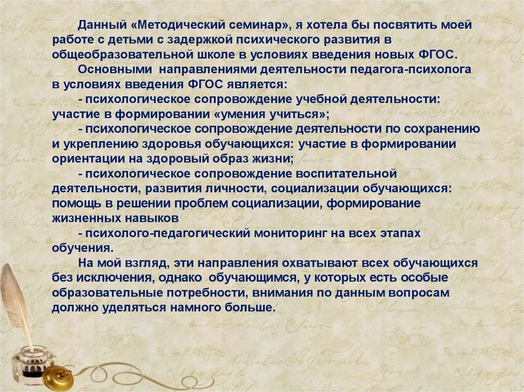 Данный «Методический семинар», я хотела бы посвятить моейработе с детьми с задержкой психического развития в