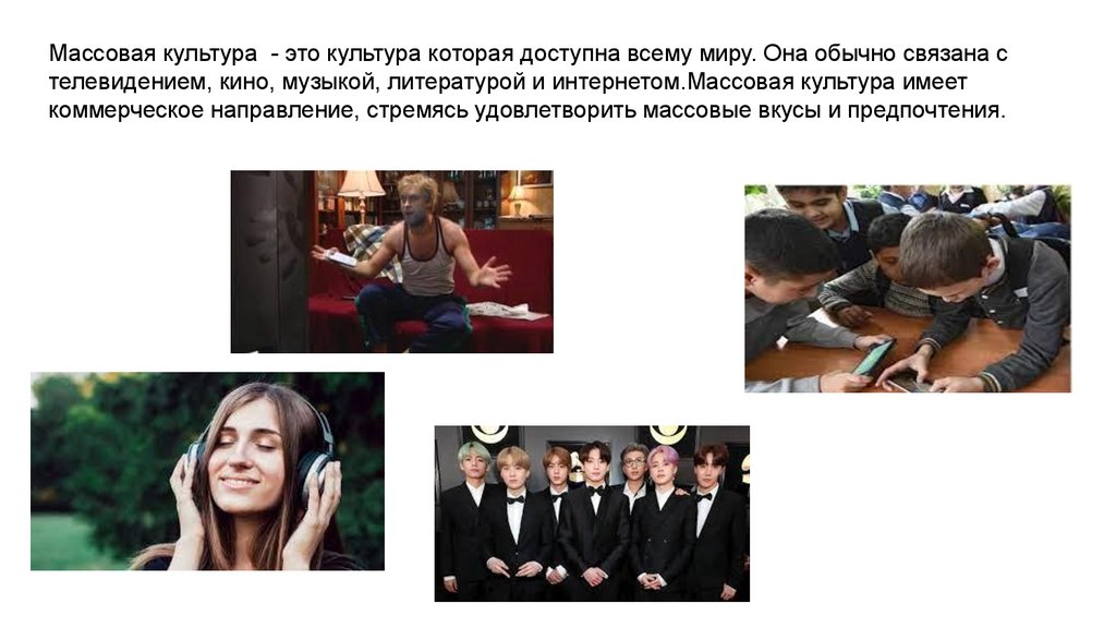 Массовая культура - это культура которая доступна всему миру. Она обычно связана стелевидением, кино, музыкой, литературой и интернетом.Массовая культура имеет
