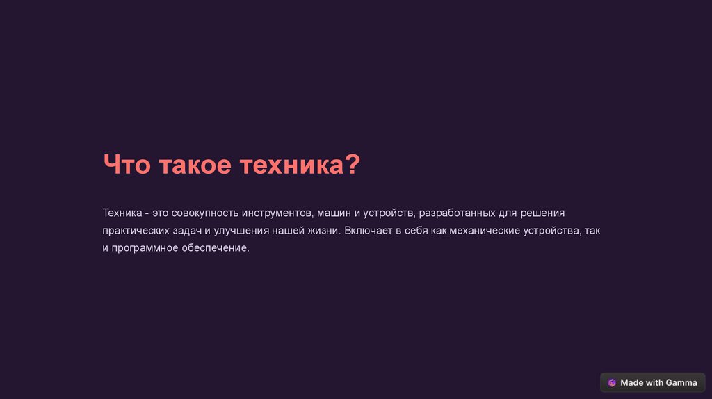 Что такое техника?Техника - это совокупность инструментов, машин и устройств, разработанных для решения