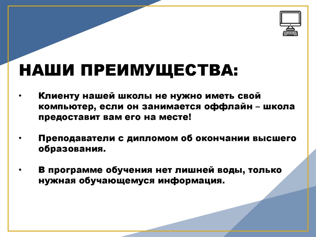 НАШИ ПРЕИМУЩЕСТВА:Клиенту нашей школы не нужно иметь свой