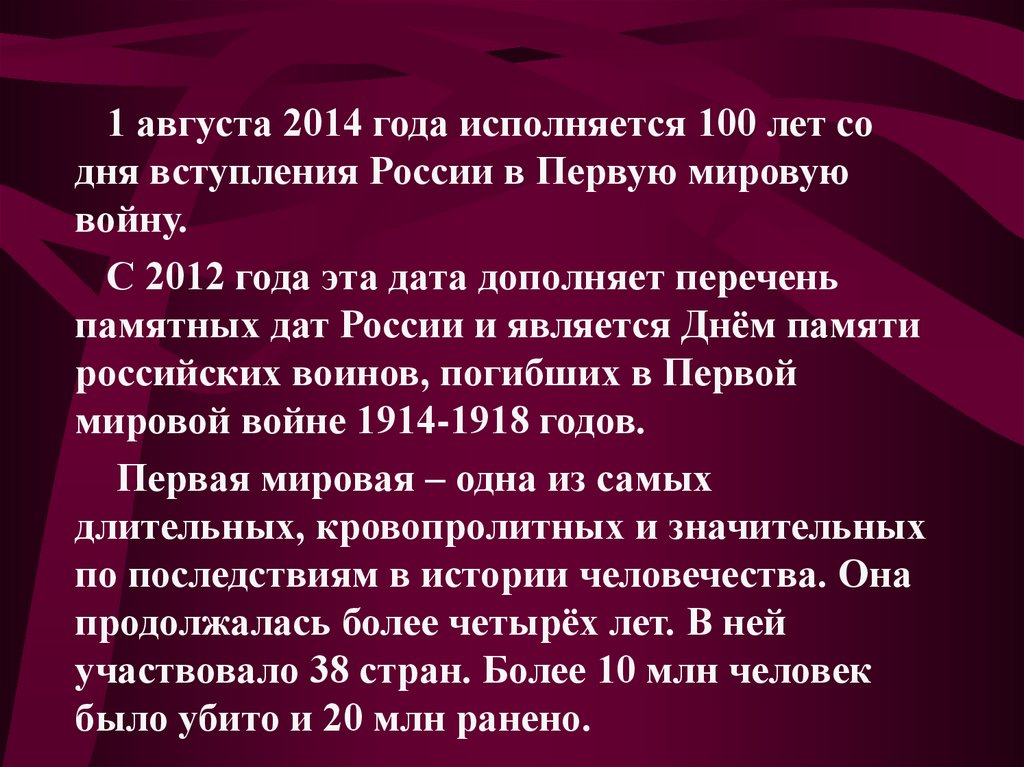 1 августа 2014 года исполняется 100 лет содня вступления России в Первую мировую