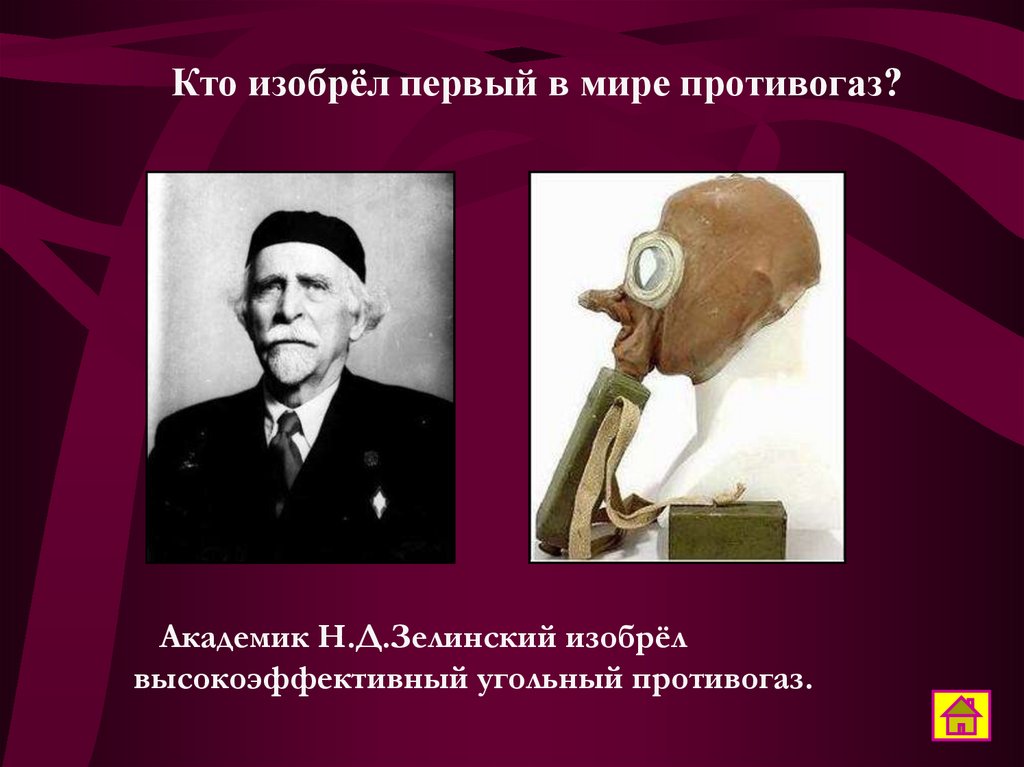 Кто изобрёл первый в мире противогаз?Академик Н.Д.Зелинский изобрёл
