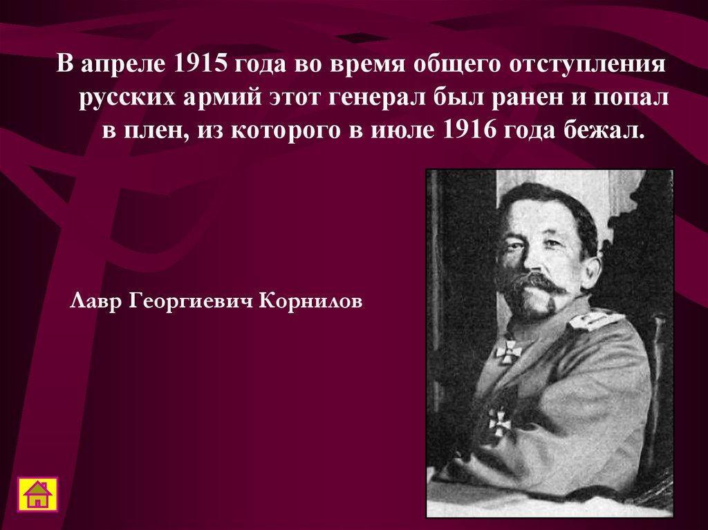 В апреле 1915 года во время общего отступлениярусских армий этот генерал был ранен и попал