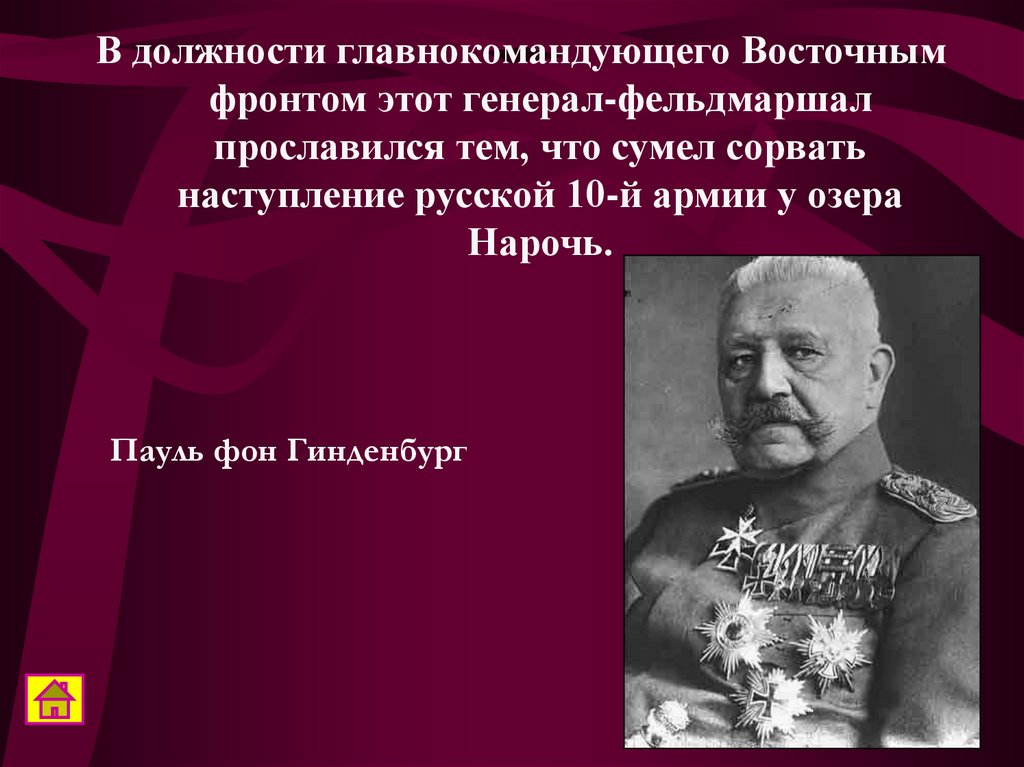 В должности главнокомандующего Восточнымфронтом этот генерал-фельдмаршал