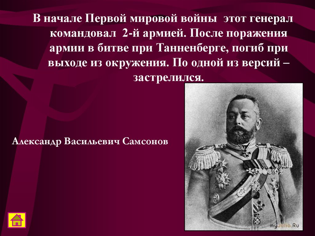 В начале Первой мировой войны этот генералкомандовал 2-й армией. После поражения