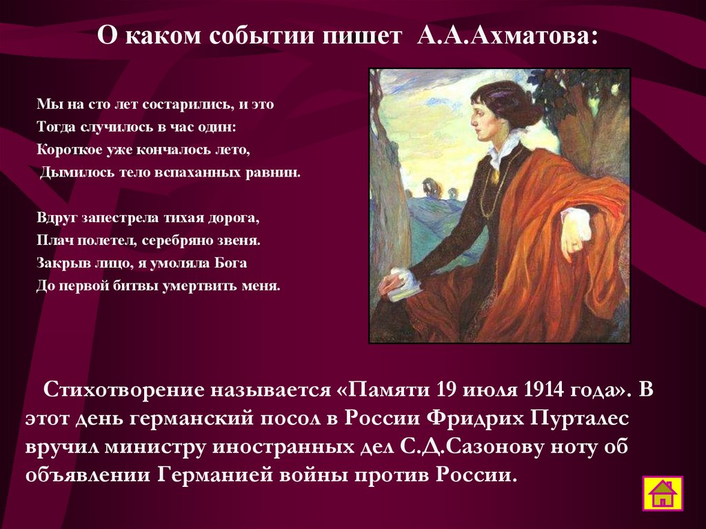 Стихотворение называется «Памяти 19 июля 1914 года». В