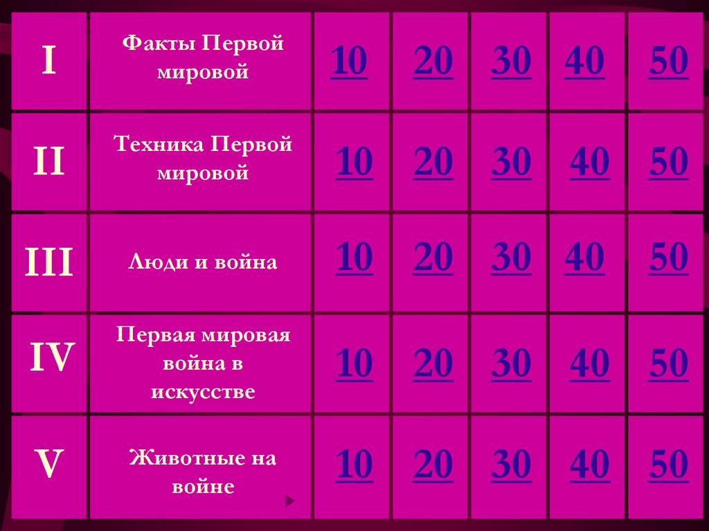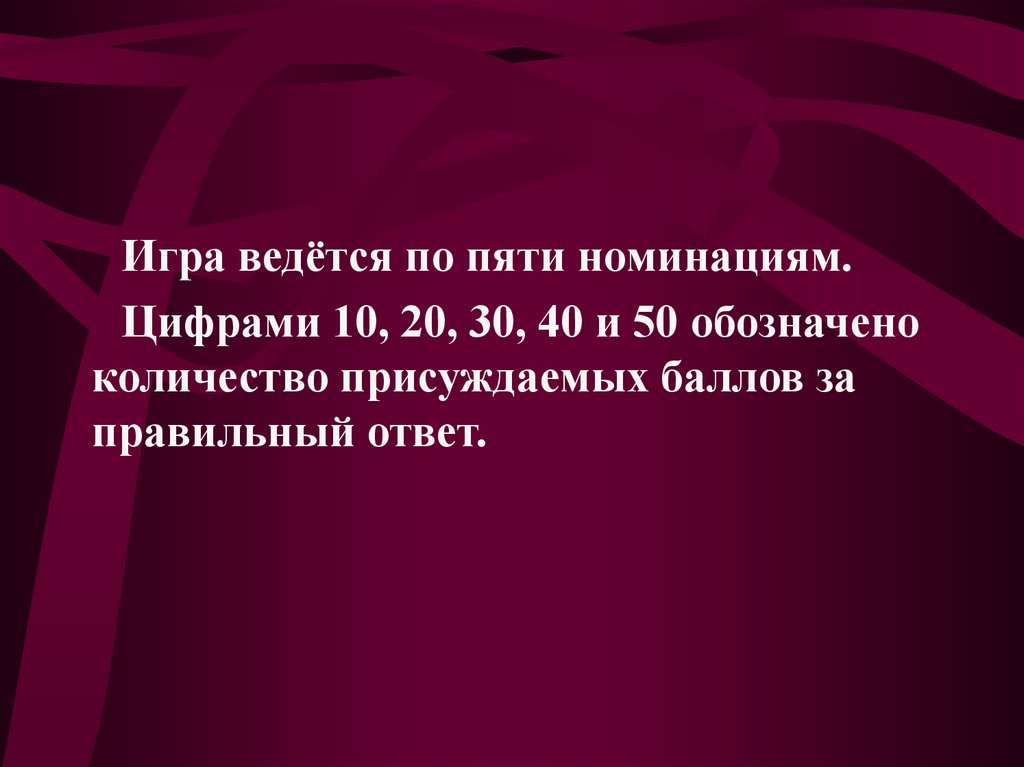 Игра ведётся по пяти номинациям.Цифрами 10, 20, 30, 40 и 50 обозначено