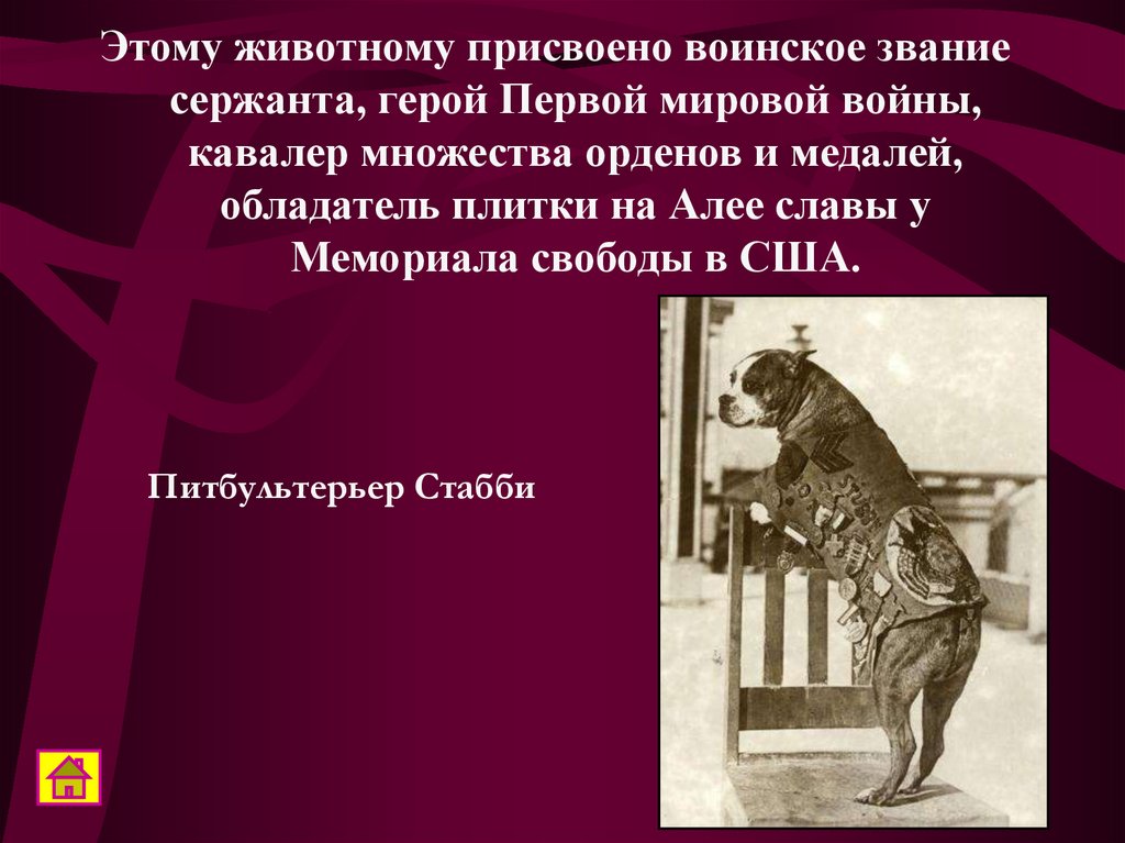 Этому животному присвоено воинское званиесержанта, герой Первой мировой войны,