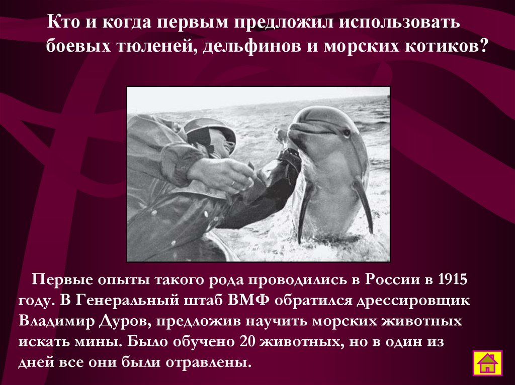 Кто и когда первым предложил использоватьбоевых тюленей, дельфинов и морских котиков?