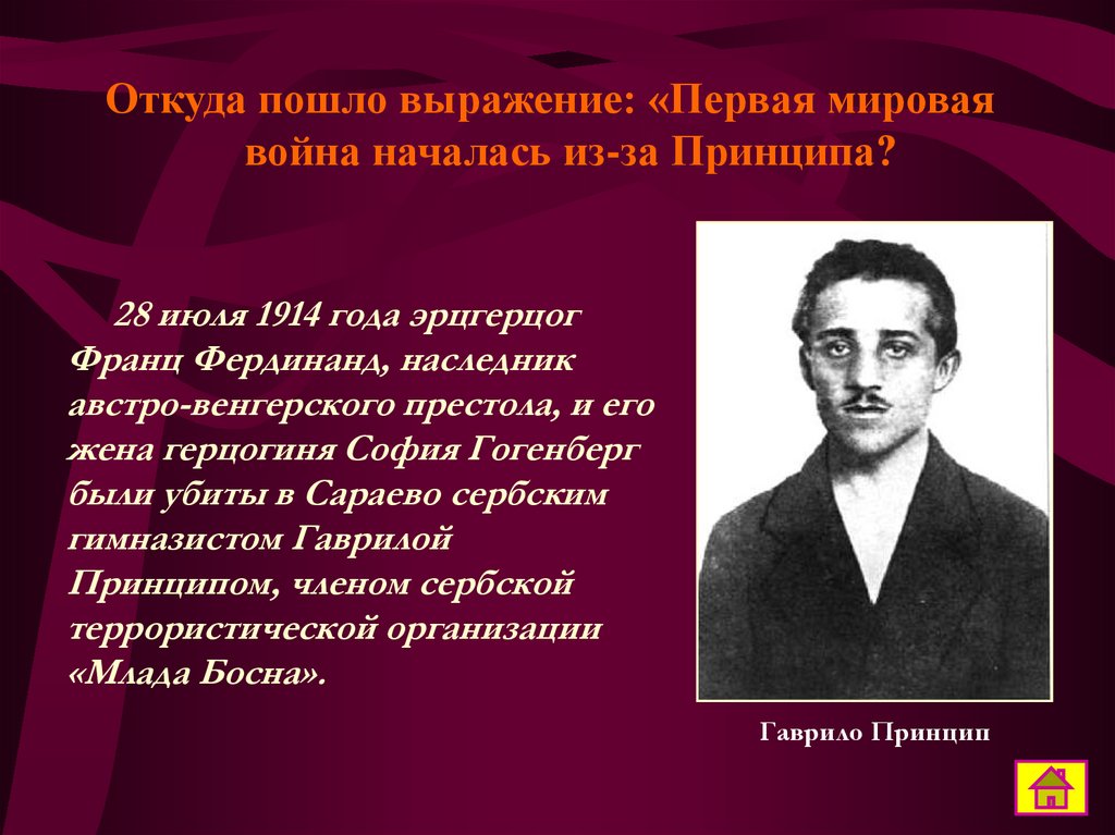 Откуда пошло выражение: «Первая мироваявойна началась из-за Принципа?