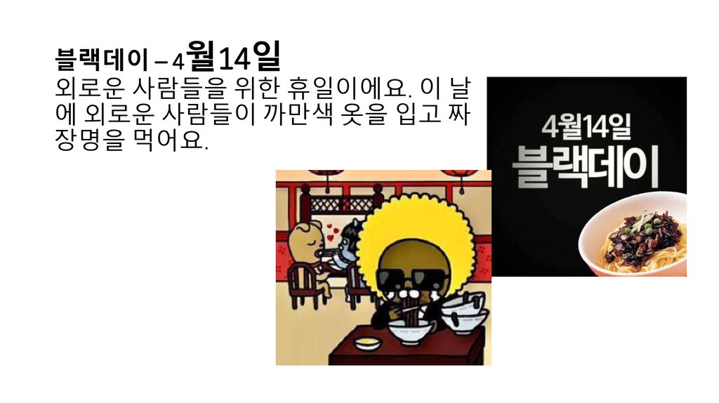 블랙데이 – 4월14일외로운 사람들을 위한 휴일이에요. 이 날