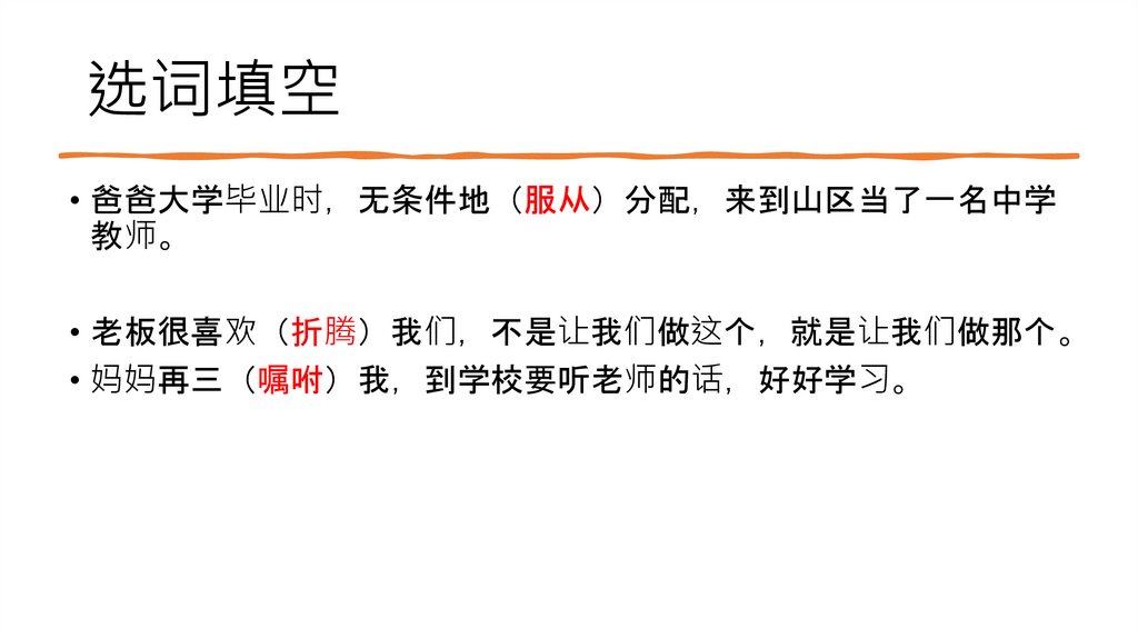 选词填空• 爸爸大学毕业时 无条件地 服从 分配 来到山区当了一名中学
