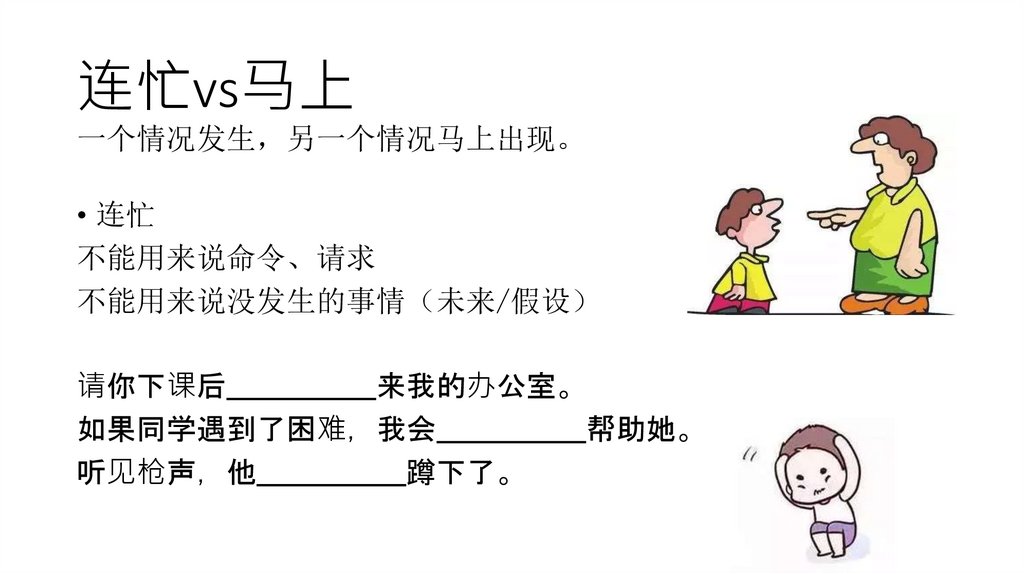 连忙vs马上一个情况发生 另一个情况马上出现。