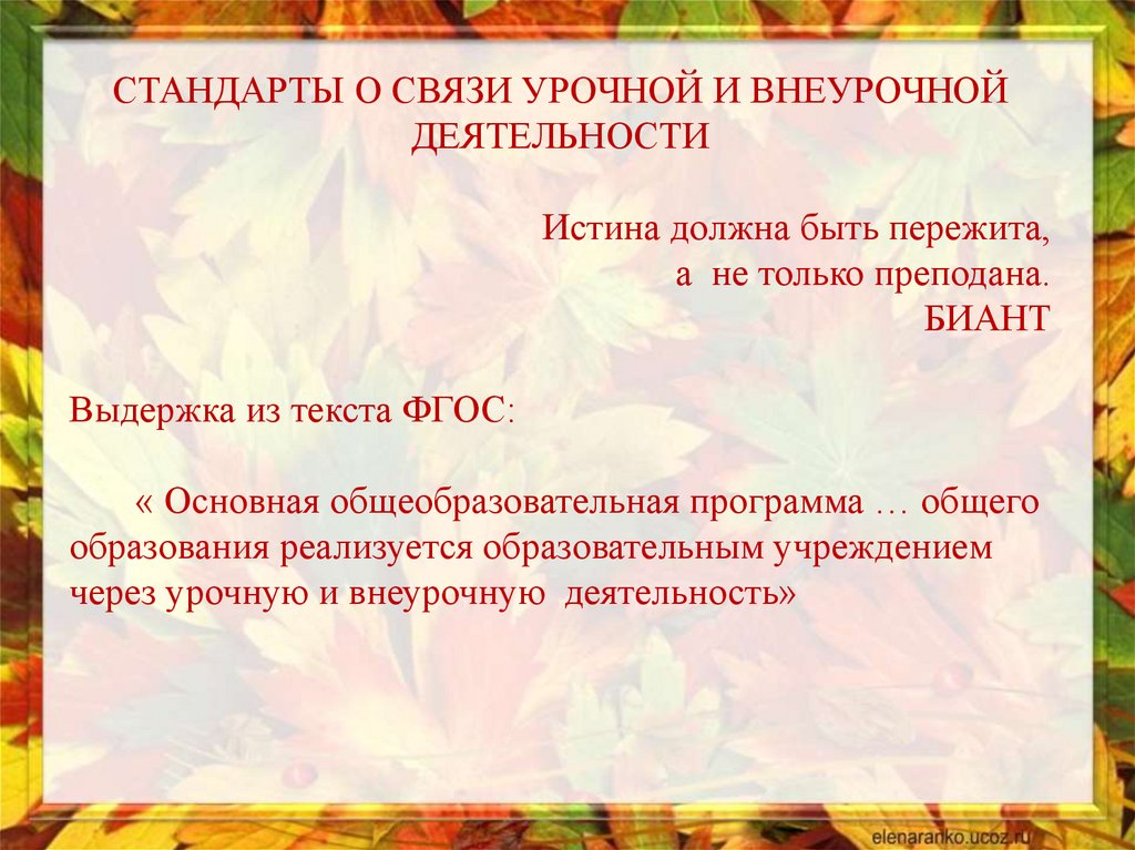 СТАНДАРТЫ О СВЯЗИ УРОЧНОЙ И ВНЕУРОЧНОЙДЕЯТЕЛЬНОСТИ