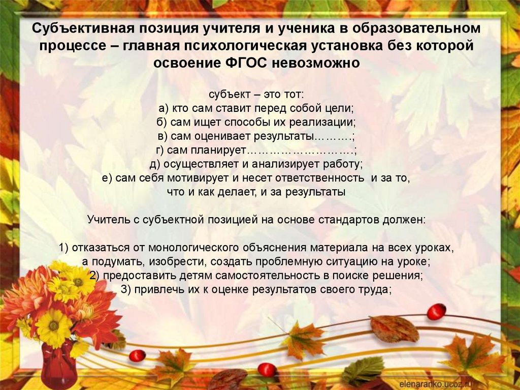 Субъективная позиция учителя и ученика в образовательномпроцессе – главная психологическая установка без которой